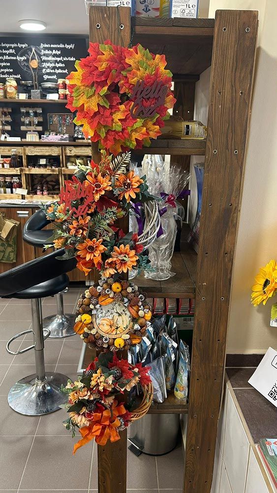 Lekvárok, szörpök, savanyúságok, mézek, asztali díszek.